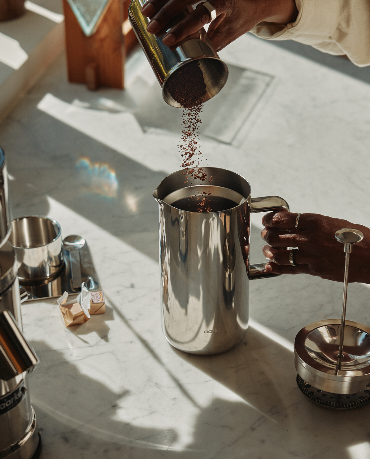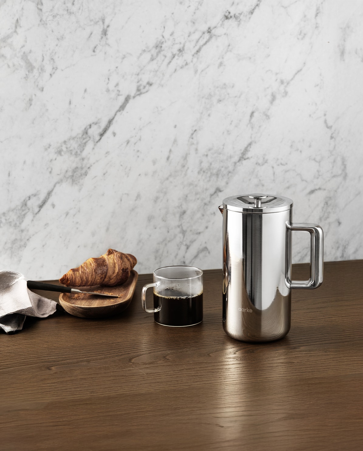 Pressen für Perfektion. Die Aarke Coffee Press aus massivem Edelstahl vereint Ingenieurskunst mit Ritual. Ihr doppelwandiger, vakuumisolierter Korpus bewahrt Wärme – und Absicht – lange über den Brühvorgang hinaus. Jedes Detail ist für Beständigkeit geschaffen: vom präzisen Edelstahlfilter bis zur kühlbleibenden Oberfläche. Eine Presskanne, die nicht nur auf Leistung, sondern auch auf Präsenz ausgelegt ist. Ein zeitloses Objekt für das tägliche Streben nach dem perfekten Kaffee.